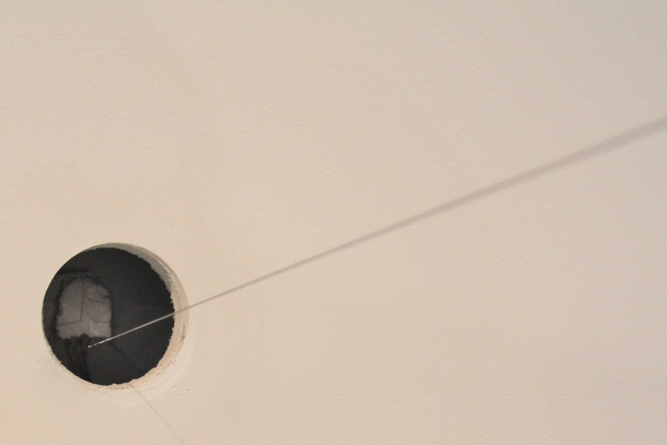 Other significant improvisations/variations: a single string spanned 2 spaces through a hole in the wall; a site specific sculptural arrangement was constructed in the main room; kitchen string was used to 'multiplex' the sound into various resonators.