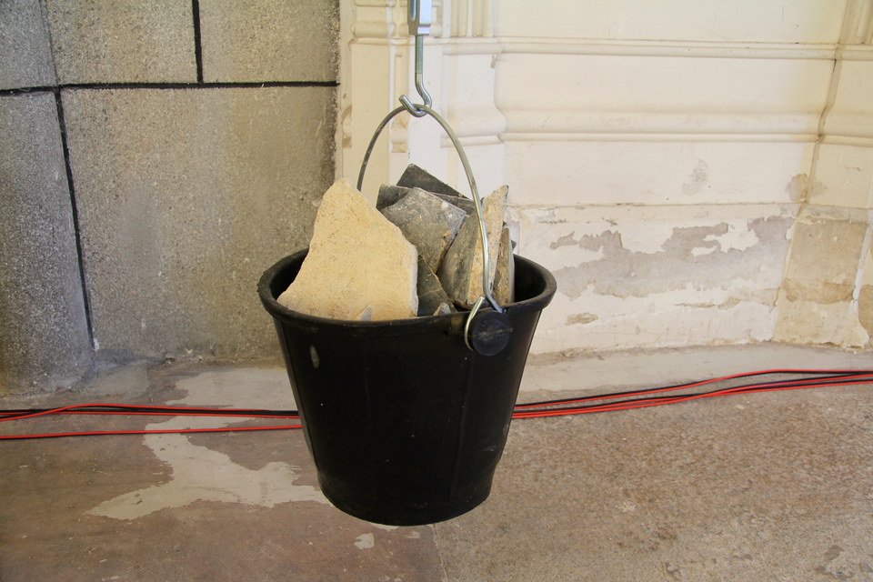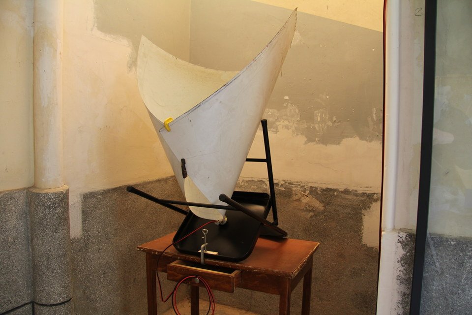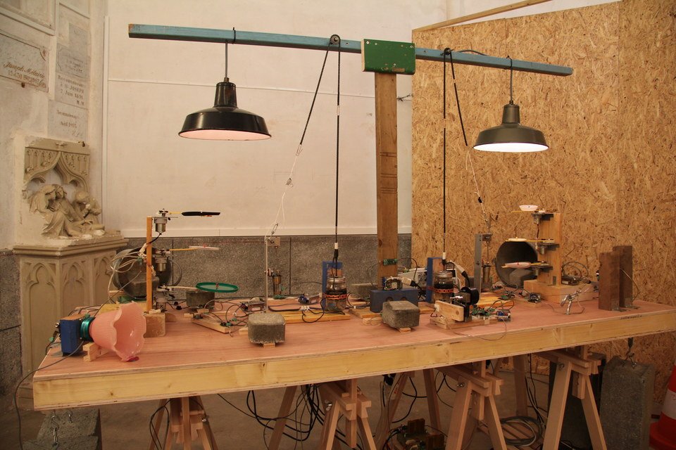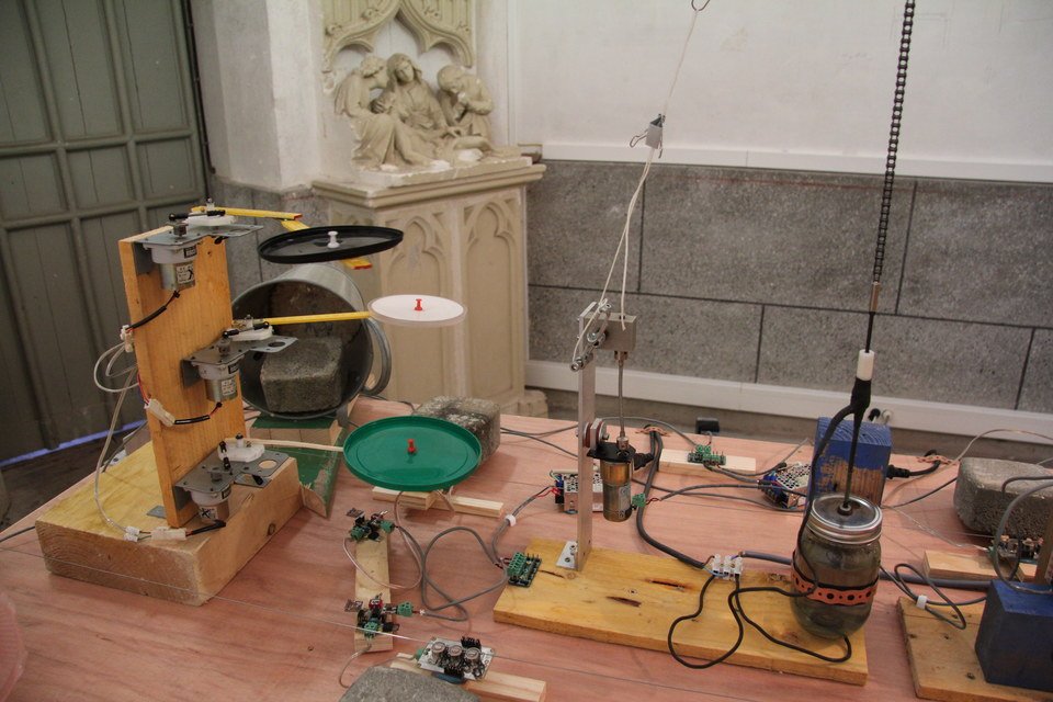 materials: variable, including: piano strings, mechanical saltwater dimmer, plywood transducer table, electromagnetic pickups, stepper motor actuated light dimmer, urine, ladder, found objects, styrofoam, hardware, electromagnetic coils, custom circuits, drums