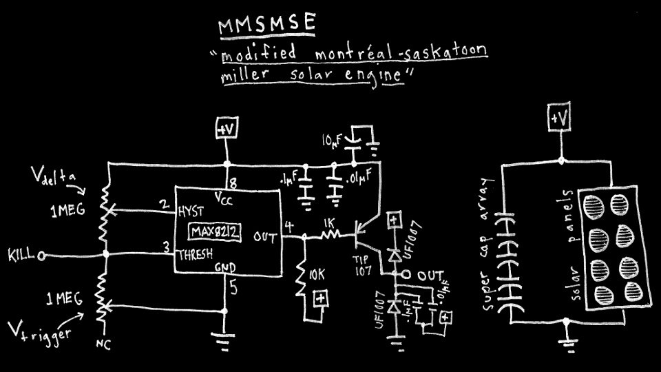 In this article I present an electronic circuit called the Modified Montréal-Saskatoon Miller Solar Engine (hereafter abbreviated MMMSE). This is released as alpha-stage open hardware for use in art projects. The most recent information on this project will live here.