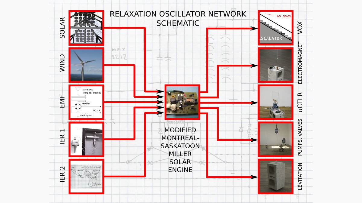 An MMMSE is a small, simple circuit that is the common, modular core component of a larger project I am working on tentatively called Relaxation Oscillator Network (hereafter abbreviated RON). RON is a system of independently operating electrical devices that use no batteries or AC. Instead, they harvest power from light, wind, electromagnetic fields and other sources. Machines in the network are in Lazymode: there are long periods where they appear to be doing nothing, yet are resting, eating energy, waiting for the right moment, until they accumulate enough to act. Two examples of Lazymode machines are described below, and videos accompany this text.