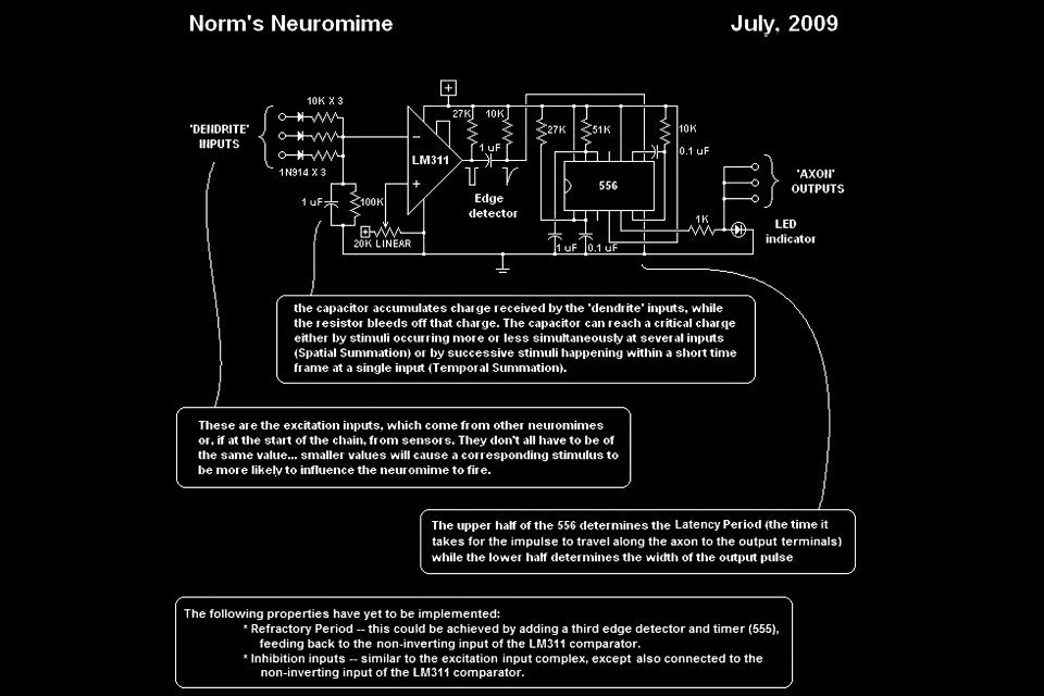 The neuromime was designed by artist Norman White and presented at the Grounding Open Source Hardware summit (Banff, 2009). In 2015, it was released as an open-source hardware project by artist Peter Flemming and computer scientist Stephen Kelly. Neuromimes: