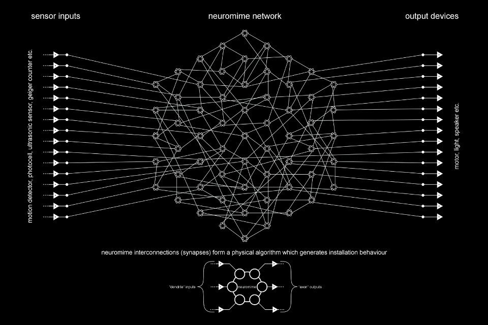 The neuromime is an open source electronic model of a biological nerve cell. Networks of neuromimes can be interconnected to create site-responsive electro-physical artworks. As muscles in a body physically articulate neurological function through gesture and voice, the behaviour of the network is expressed through pulsing patterns of sound, light, and motion.