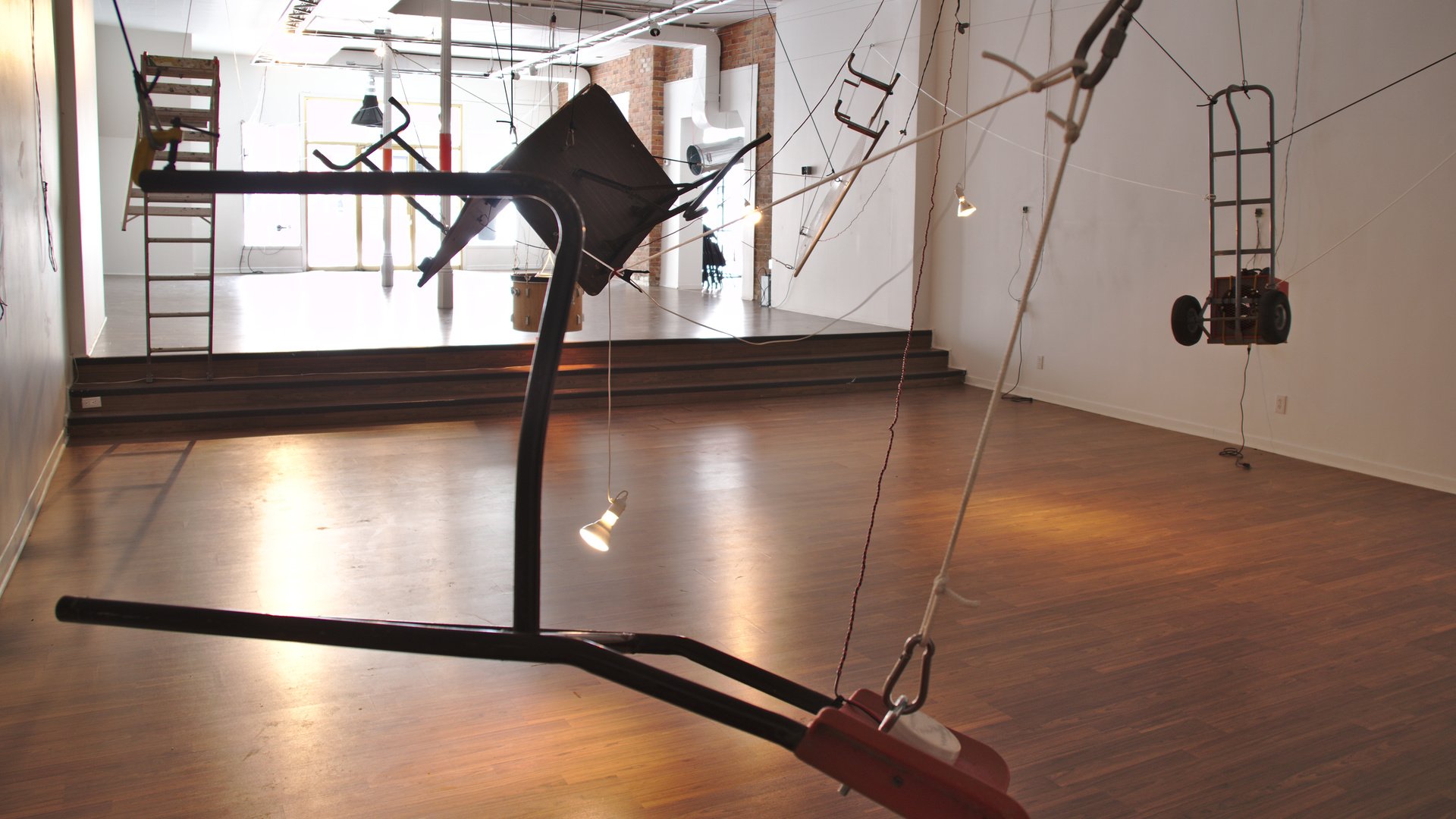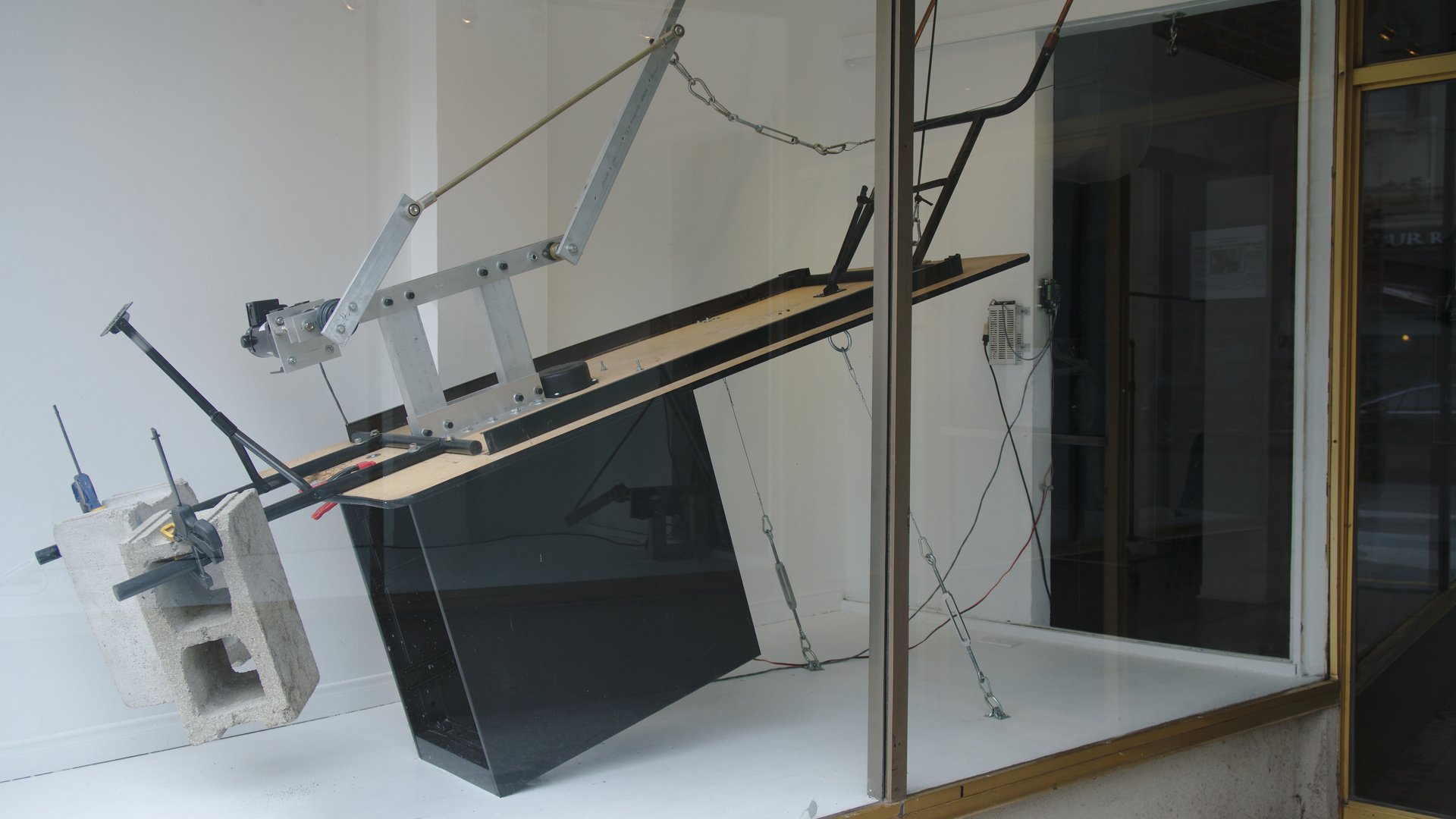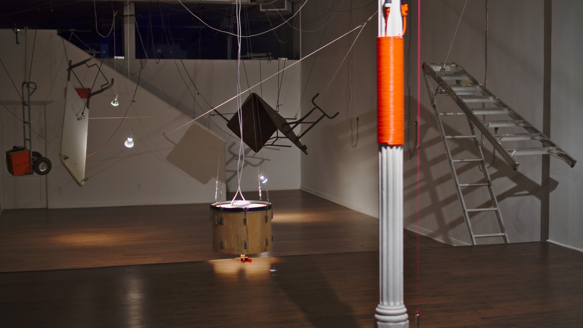 diverse materials and objects found on-site, rope, stretch cord, iron columns as electromagnets, HVAC sound distribution system, mechanical actuators, stepper motors, custom microcontroller network, custom software