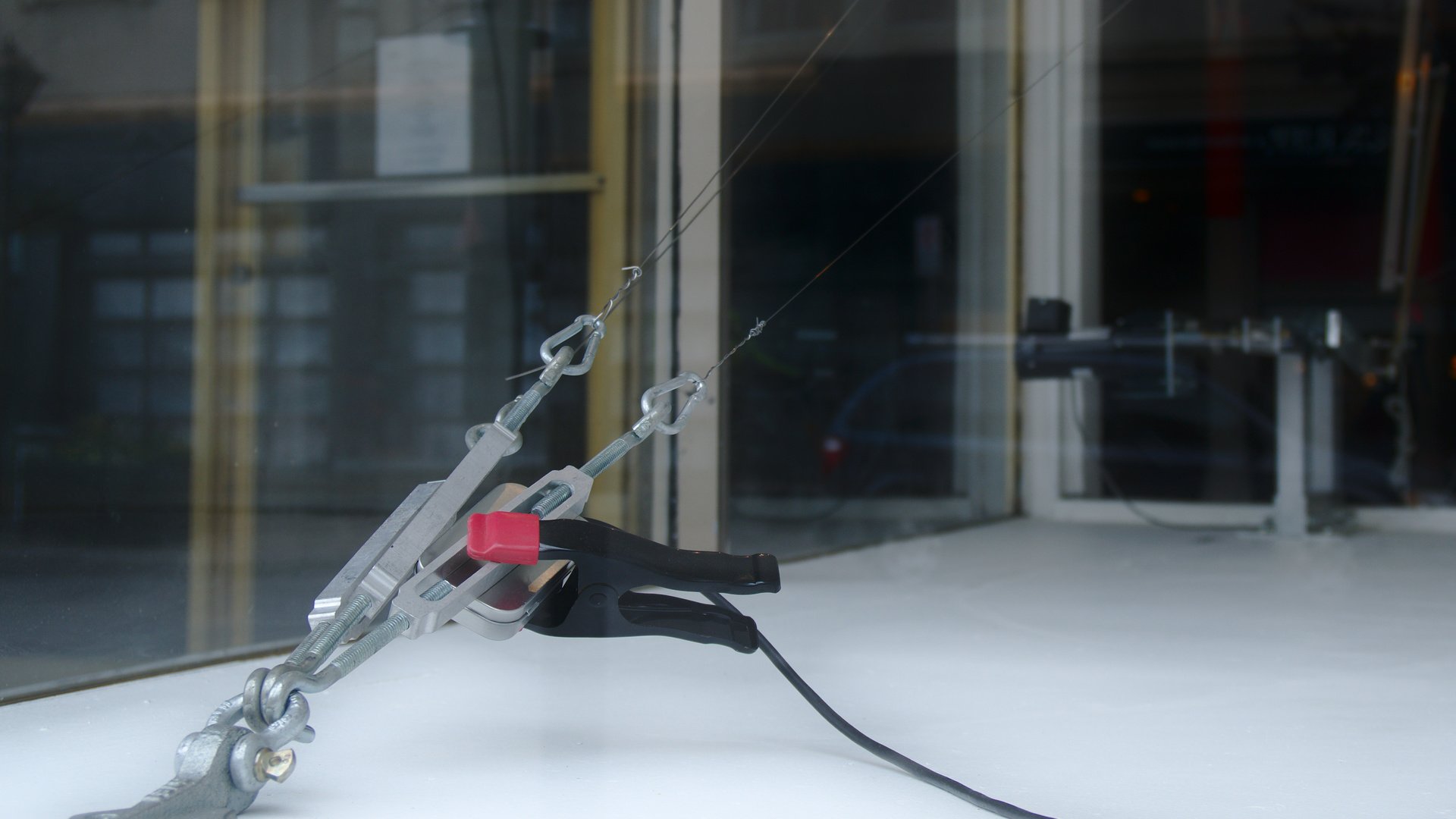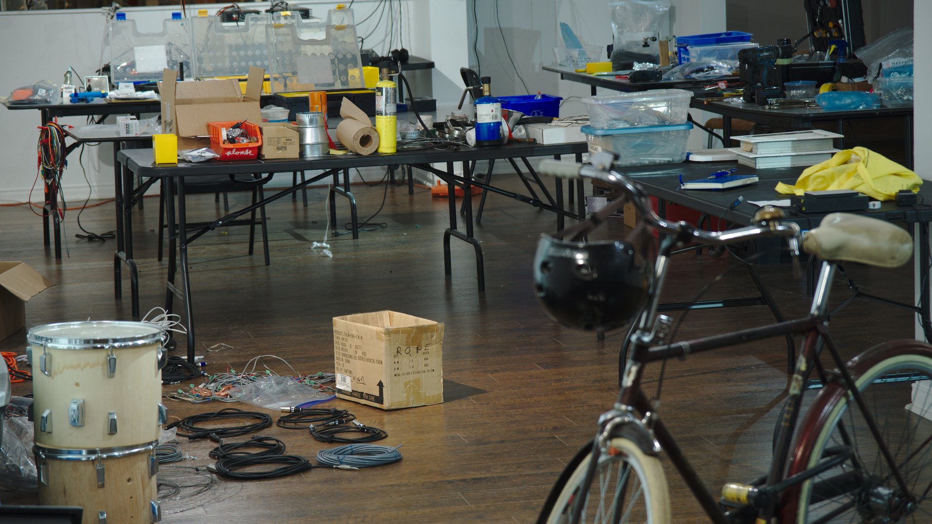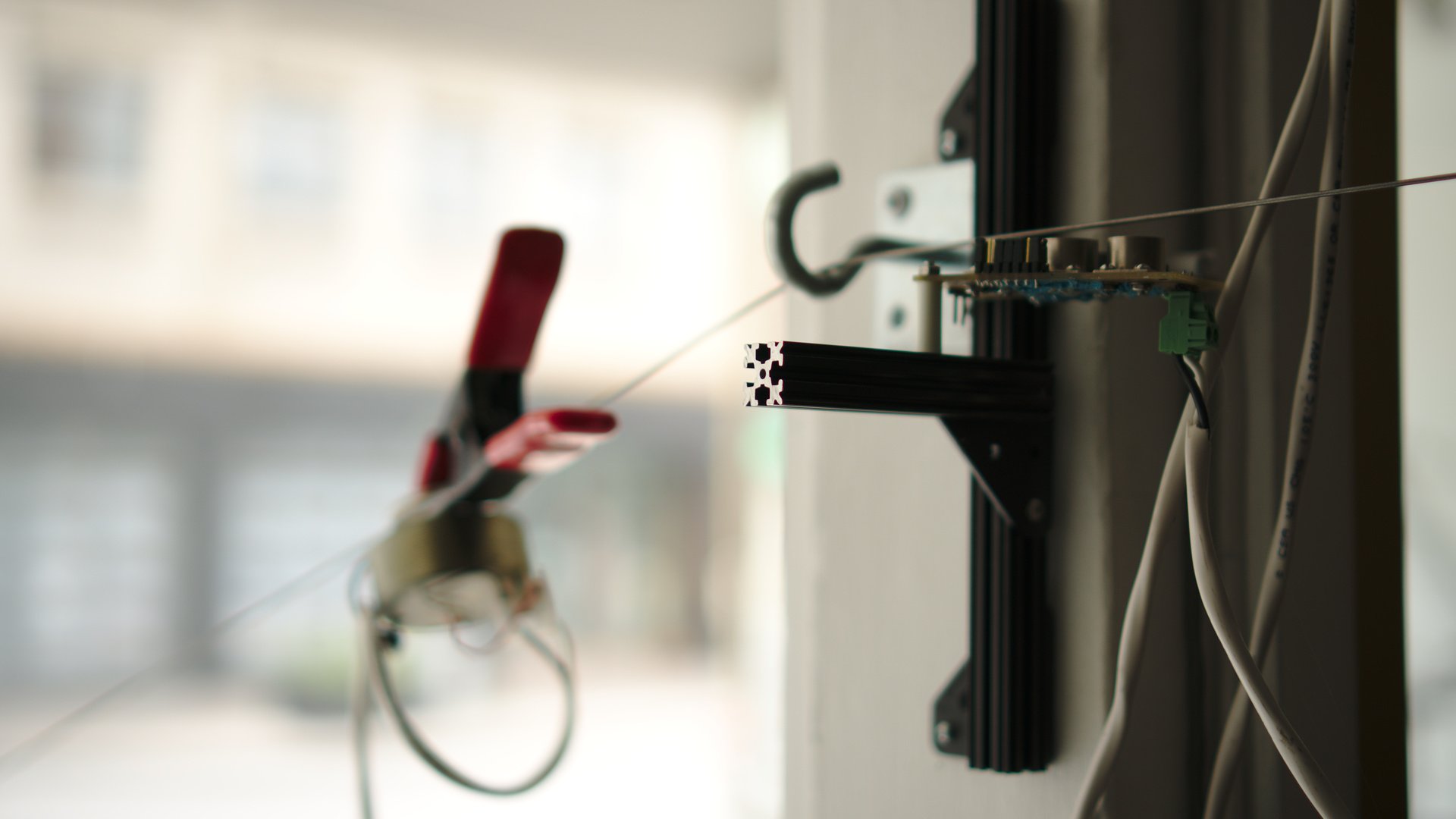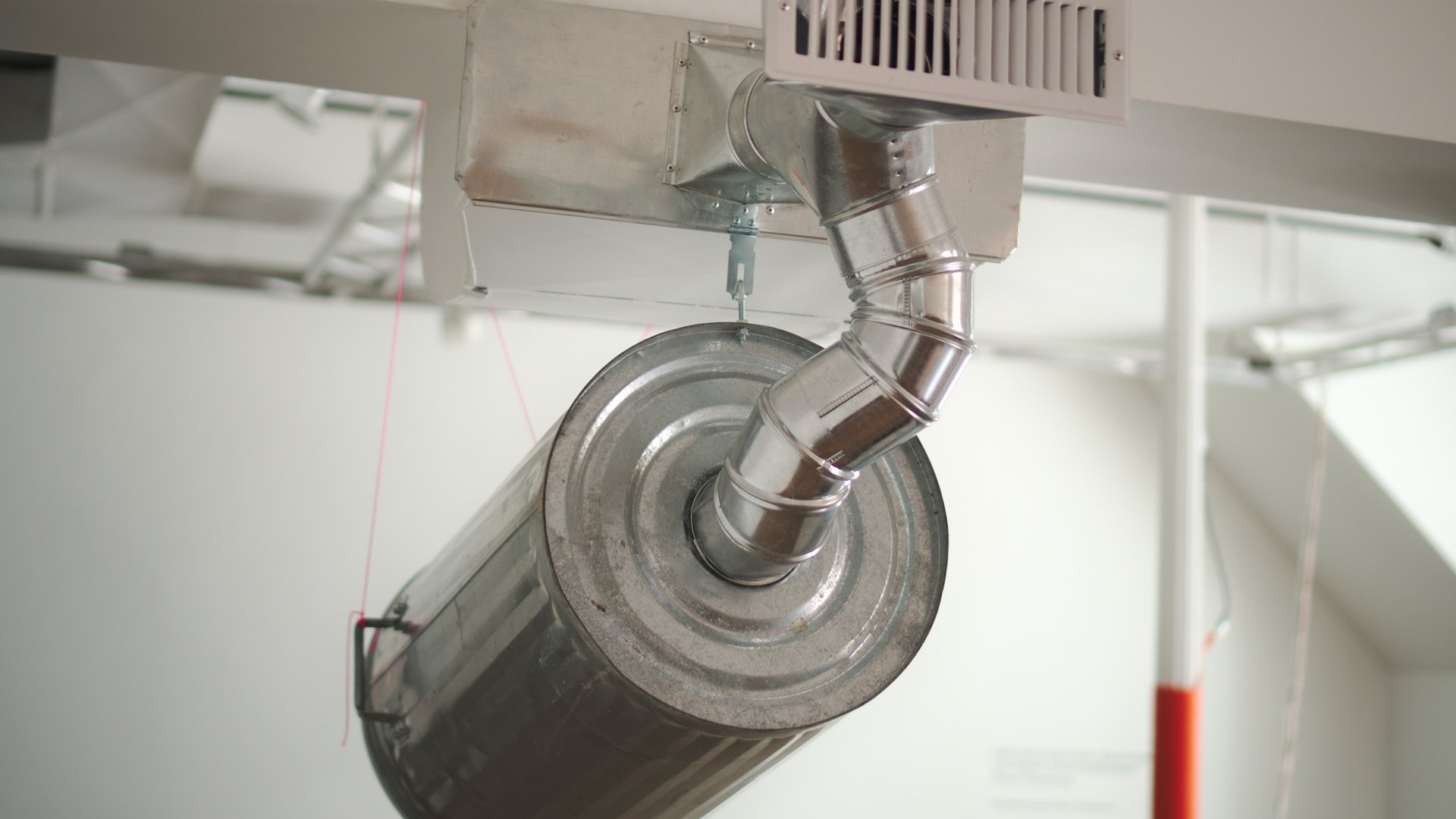 diverse materials and objects found on-site, rope, stretch cord, iron columns as electromagnets, HVAC sound distribution system, mechanical actuators, stepper motors, custom microcontroller network, custom software