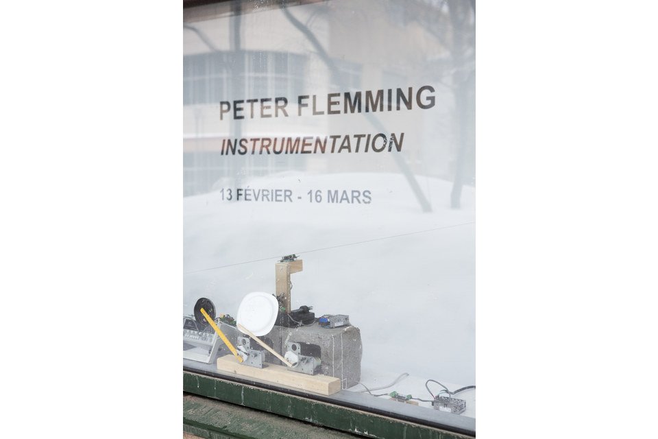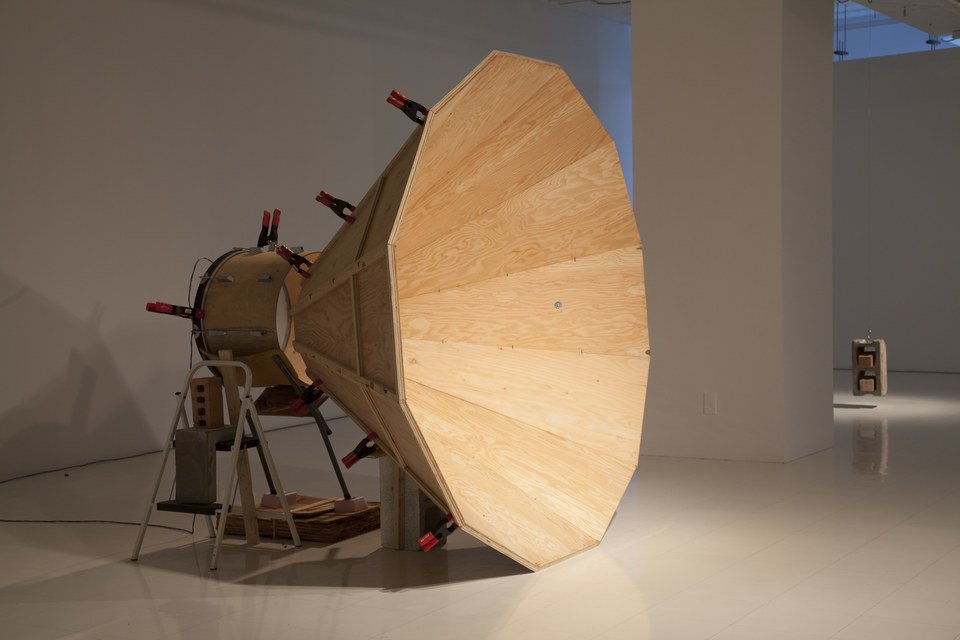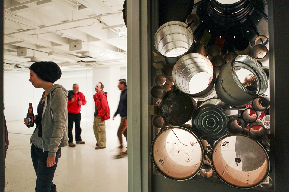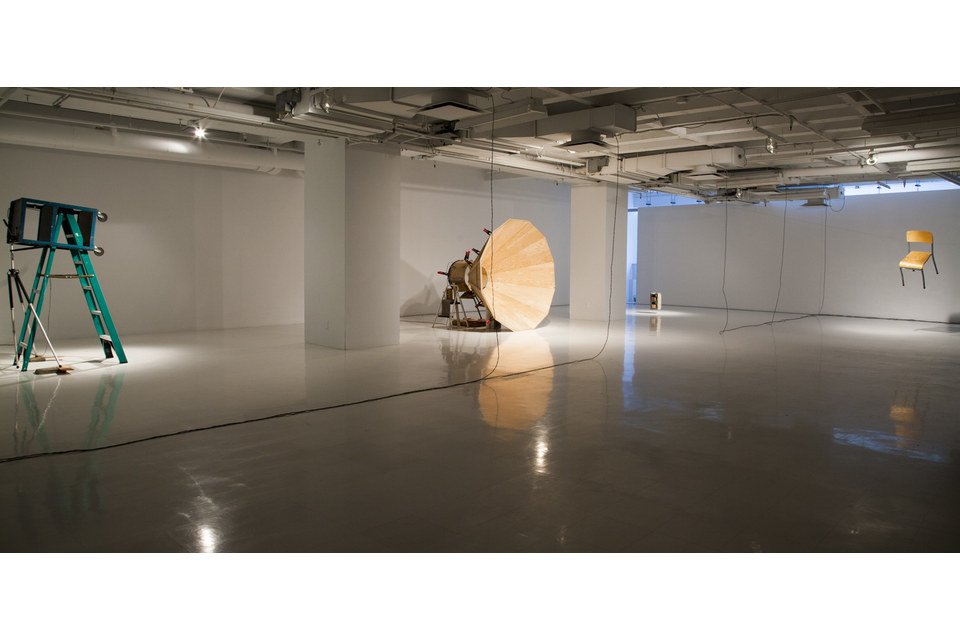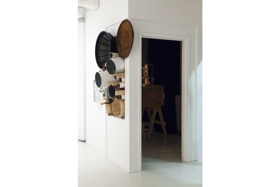 Site specific eighth variation of Instrumentation. In the main gallery space overhead HVAC conduits and several found object assemblies became loudspeakers and sound resonators. The gallery kitchen, front window vitrine and reading room (not shown), peripheral spaces not ordinarily used for exhibition, were occupied by ensembles of mechanical performers, whose sound was amplified and mixed in the main space.