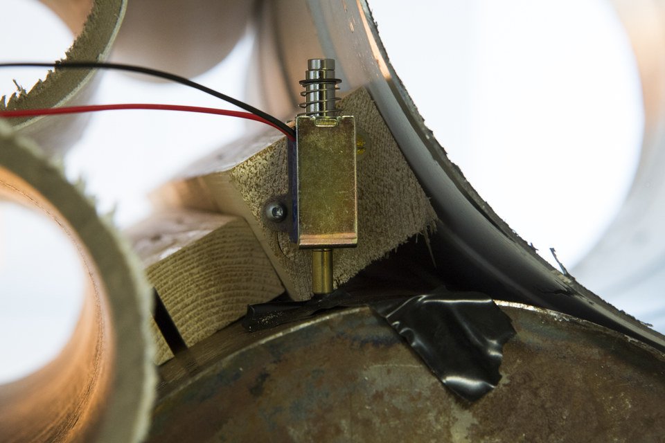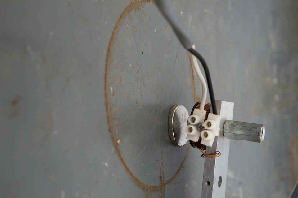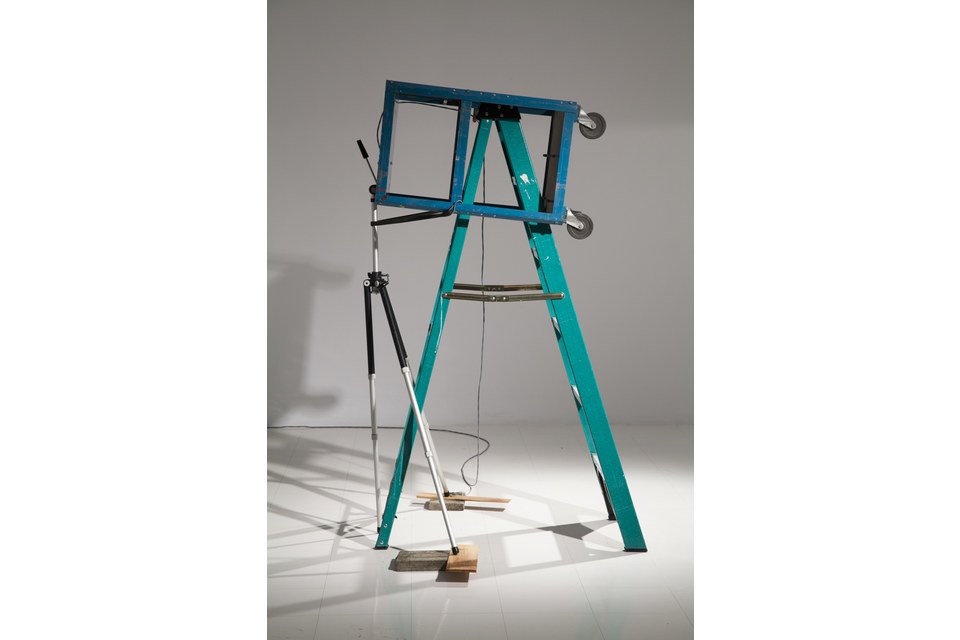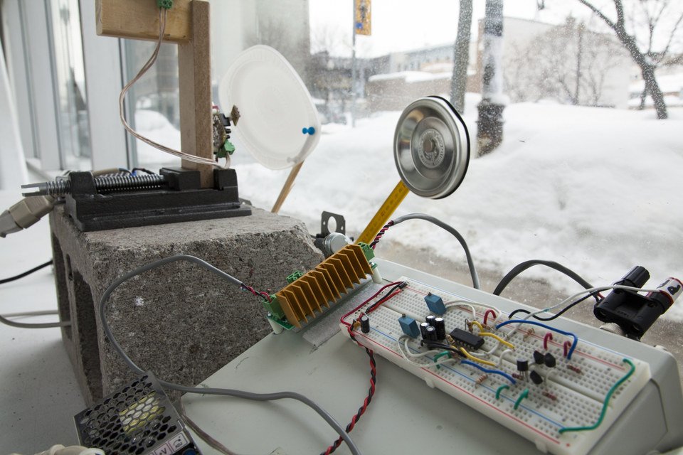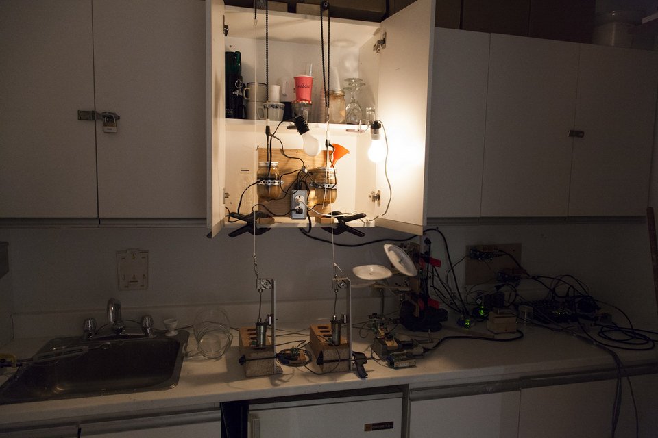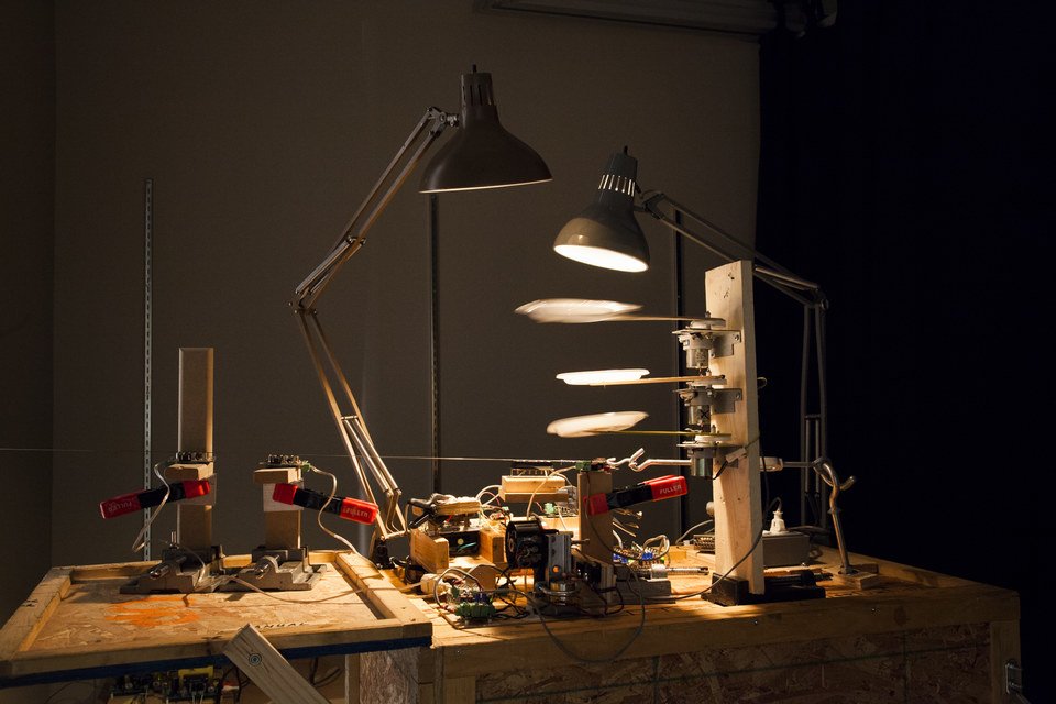 materials: variable, including: piano strings, mechanical saltwater dimmer, plywood transducer table, electromagnetic pickups, stepper motor actuated light dimmer, urine, ladder, found objects, styrofoam, hardware, electromagnetic coils, custom circuits, drums